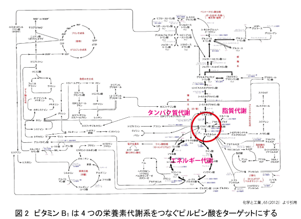 世界に先駆けて発見されたこの物質は現在ビタミンB1に分類されています。なぜこれが普遍的物質かといいますと、タンパク質代謝、糖代謝、脂質代謝、そしてエネルギー代謝をつなぐ中心物質であるピルビン酸の代謝に関わる酵素(専門的にはpyruvate dehydroxylase)の働きを活性化する鍵化合物だからです(図2)。ビタミンB1の欠乏はこうした多様な新陳代謝の不調を招きます。そして労働に必要なエネルギーの生産の道を閉ざします。その結果としての症状の一形態が脚気という病態だったというわけです。鈴木博士は、基礎研究に踏み入ったからこそ、より大きな出口すなわち日本の栄養・食糧面での国策の改革、ビタミン産業の創出などの成果を世に施しました。図1のモデルです。
