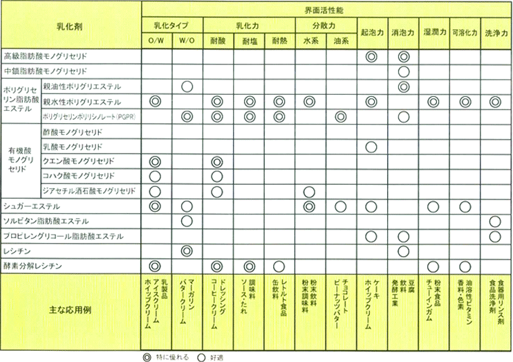 乳化剤の用途は、大別すると以下のように「界面活性能」と「界面活性能だけではない各種改質効果」と言えるでしょう。表1・2には乳化剤の種類と用途について、まとめました。