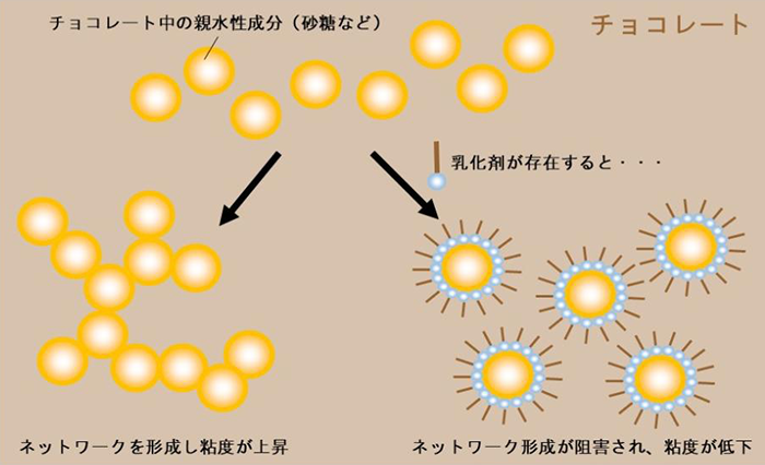 砂糖のような親水性の素材をチョコレートに加えると、親油性のチョコレートよりも親水性の素材同士の方がなじみやすいため、それら同士でつながり合ってしまいます。この親水性素材同士のネットワークによってチョコレート全体の粘度が上がってしまうため、処方や工程によっては溶かしたチョコレートが扱いにくい物性になってしまう、という現象が発生します。
