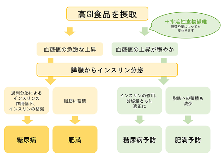 食後の急激な血糖値の上昇は、生活習慣病(肥満・糖尿病)を招く要因のひとつです。水溶性食物繊維の中には、食後の血糖値の上昇を穏やかにし、かつ高GI食品のGI値を低下させる働きがあります。つまり、高GI食品だからと我慢していた食品を食べても、その影響が少なくなるということです。これは肥満や血糖値で悩んでいる人には朗報ですね。