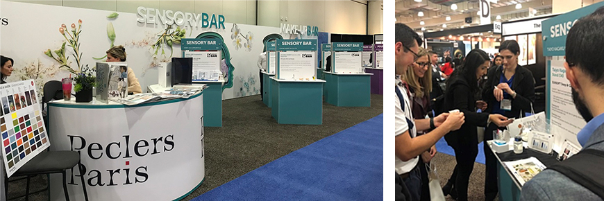 Sensory Barというスペースでは、出展する原料メーカーの化粧品処方例が展示され、各社の化粧品処方の効果や感触を気軽に試す事が出来ます。広い展示会場を回る事無く、一箇所で各原料を活かした化粧品処方サンプルを試すことができる便利なスペースであり、賑わいを見せていました。当社もクレンジング処方例として高機能なポリグリセリン脂肪酸エステル(PGFE)を配合し、優れたメイク落ち機能と、高い保湿性、使用後の肌のしっとり感、PEG-free を兼ね備える「オイル」「ローション」「ホットジェル」の3点の処方サンプルを展示し、中でもホットクレンジングジェルがユニークな剤型として人気がありました。Sensory Barと同じくらいの規模でMakeup Barもあり、こちらではファンデーションをはじめとしたメイクアップ用品を試すことができます。