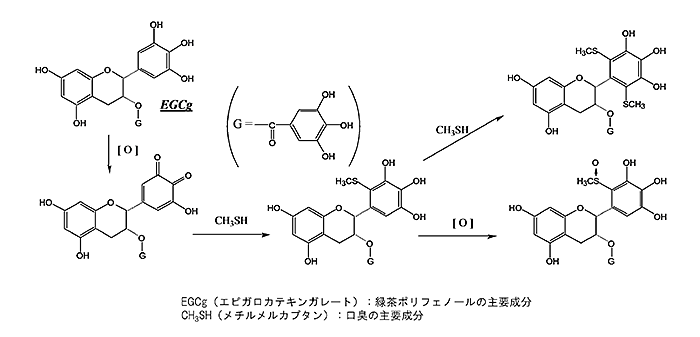 例えば、口臭の抑制。緑茶に消臭効果があることは古くから知られており、生活の知恵としても利用されてきた効果です。緑茶にはポリフェノール化合物が多く含まれており、その含有するフェノール性水酸基を介してにおい成分と化学反応を起こすことでにおい成分を化学的に変える、という性質を持っています。